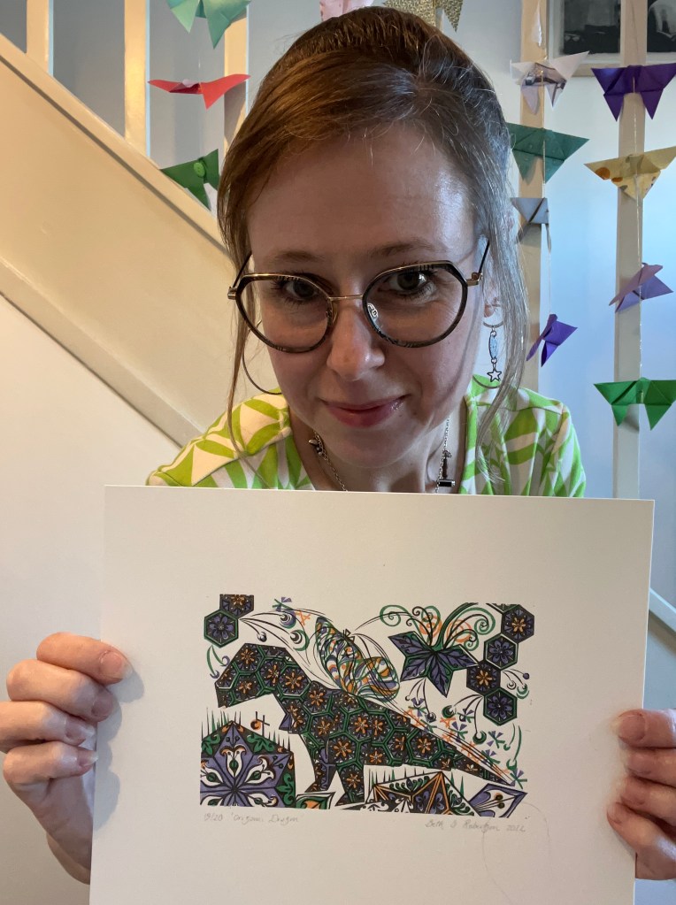 Here I am holding the little origami dinosaur. This took months to come together to make this little print and now its available through the link on my home page… Have a great day and shine…