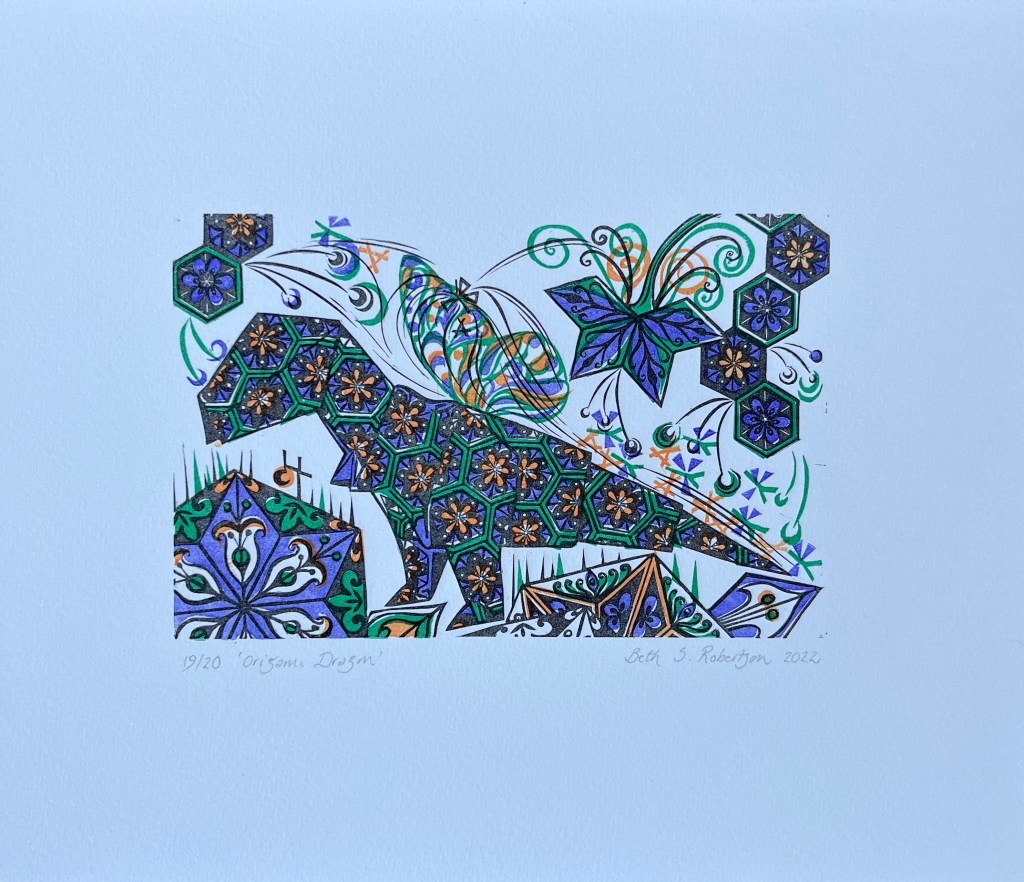 This 4 colour wood engraving is strictly limited to 20 copies, For the next 3 days this print is available with 50% off. Follow the link to my shop to purchase. I’m sure you will agree this little origami dragon will bring a bit of shine to any room in your house.